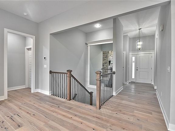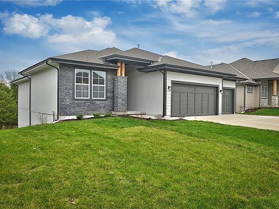 The Ashland reverse 1 1/2 has a great open concept floor plan. Hardwood floors flow throughout the entry, great room, kitchen and dining room. Walk in to see the windows alone back wall with stone gas fireplace. The kitchen with center island includes granite countertops, apron sink, custom cabinets with soft close drawers & doors, upgraded hardware, stainless appliances and walk in pantry. Large dining area leads out onto the large covered deck. The Owner's suite with vaulted ceiling leads into a spa like bath with stunning granite double vanities, tile floors, separate soaker tub and large walk in shower. Huge closet connects to a convenient laundry room with built ins. Second first floor bedroom is a multipurpose room that can be used for a home office, guest room, craft room or whatever your need might be. Another bath is adjacent to this room. The U-shaped staircase leads down to the large rec room with a wet bar. Another bedroom and bath complete the lower level finish. A storm room is included for your safety in case of bad weather. Tons of storage in the unfinished basement. Three car garage and sprinkler system are standard. Prairie Farms is adjacent to the newly renovated Lake Olathe which offers tons of outdoor activities. Prairie Farms is a great place to call home.