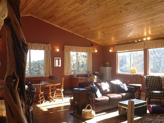 Breathtaking views out every window in this one-of-a-kind Lodge like feel custom home. Energy efficient, passive solar & stainless steel appliances. Bright & open with vaulted wood ceiling & heated floor + amazing hand made juniper log poles makes this country living at its best! King of the mountain with extended decking & hot tub to enjoy every minute. Large shop w/extension on bottom of property, could be a mother-in-law. 2 stall barn, tack room, chicken coop & green house. Full RV hookup.