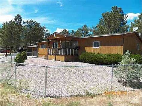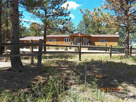 Mfg home on 0.6 acre lot in Pondersa Subdivision. 3 bedrooms, 2 baths. Addition off kitchen. Front covered deck. Wooded lot and low maintenance yard. 2 car detached garage and additional 22x36 garage for RV or boat storage. Property has been converted to real estate. Good access to Hwy 385/79.
