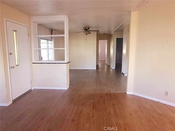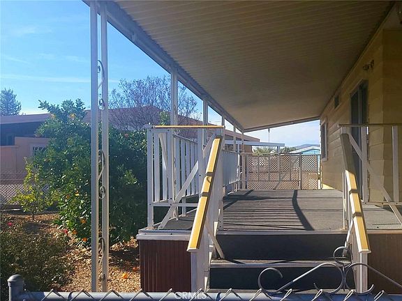 This Mobile Home is located in the gated 55+ community of Sun City Estates located in Sun City Menifee. Home offers 2 bedrooms & 2 baths with living room/dining room with built in hutch. There is an additional room located off of kitchen for use as dining room or den/family room with a sliding glass door out to the covered porch. Kitchen offers newer appliances and garbage disposal. Inside laundry room with storage comes with washer and dryer. Space offers an extra large (fully fenced) yard with multiple adult fruit trees. Covered carport can hold 2 cars or an rv/camper with a 220v 30 amp newly installed. Seller has also replaced water heater, air conditioner condenser and in 2022 replaced 48 pads/piers with a lifetime transferable warranty as well as leveling the mobile. Seller has taken great care of this home and it is a MUST SEE!