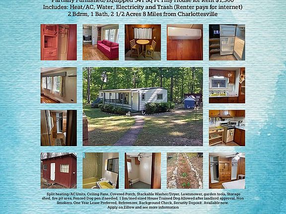 Partially Furnished/Equipped 541 Sq Ft Tiny House for Rent $1,250 Includes: Heat/AC, Water, Electricity and Trash (Renter pays for internet) 2 Bdrm, 1 Bath, 2 1/2 Acres 8 Miles from Charlottesville Split heating/AC Units, Ceiling Fans, Covered Porch, Stackable Washer/Dryer, Lawnmower, garden tools, Storage shed, fire pit area, Fenced Dog pen if needed, 1 Sm/med sized House Trained Dog Allowed after landlord approval, Non Smokers, One Year Lease Preferred, (but do month to month also) References, Background Check, Security Deposit. Available now. Maximum 2 occupants due to tiny space and water heater A rental agreement/contract will be signed by renter/landlord and agreed upon terms. I rent month to month so if rental does not work out for renter they can give 30 day notice and same for landlord, if renter breaks rental agreement/contract, renter will have 30 day notice to vacate. Only two people may live in rental at at time and two vehicles. I have fencing available to make fenced kennel area for small dog if needed. Renter will be provided a lawnmower and be expected to maintain mowing the grass. I have insurance that covers my belongings and property, it is recommended renters have their own renters insurance.