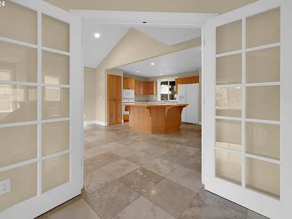 Breathtaking, custom-built contemporary home with beautiful views! Three bedrooms, two upper, each with its own bath, and lower level bedroom with french doors and private bathroom. Great room-style kitchen/dining room, light-drenched with vaulted ceilings and skylights. The kitchen features travertine counters and floors. Primary features soaking tub and ample dual walk-in closets for plenty of storage and organization. The yard is low-maintenance and perfect for taking in the beautiful views of the coast range.