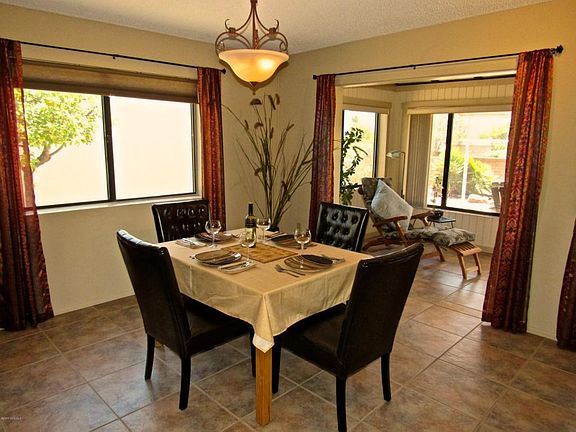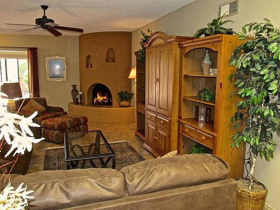 Rare 3-bedroom Miramar is located on a prime lot in Desert Hills V with a great mountain view. Home features 2,050 sq ft, 2 baths, fireplace, finished AZ room, and 2-car garage with ample storage. Being sold completely furnished--furniture, decor, linens, and kitchen items--just as pictured. Master bath has dual sinks, a separate shower, and garden tub. Attractive eat-in kitchen, 16 x 16 tiles, and neutral carpeting in home. In addition to the AZ room, there are covered patios in the rear and a private, sheltered setting off the kitchen. Home is well cared for, light, bright, and move-in ready. Great winter residence, year-round home, or investment property with an excellent rental history. Enjoy morning coffee or evening cocktails while watching the ever-changing Santa Ritas.