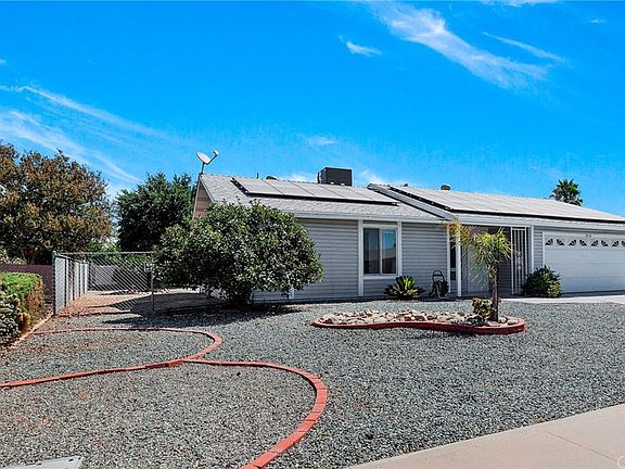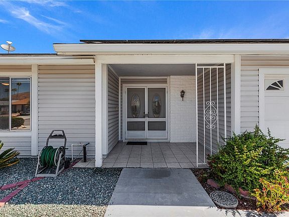 Stunning home in Menifee's Sun City 55+ community. 1324 sf of beautiful living space with impressive double door entry. Elegant upgraded wood look plank tile flooring and freshly painted walls are just some of the features of this find. The bright and light kitchen has granite counters and peninsula with seating along with maple cabinets and open to a large casual dining area! Refrigerator can stay. Two large bedrooms (one with a huge walk-in closet) and two bathrooms along with an ample two car garage!. Other features include ceiling fans, ring doorbell, newer heating and AC and newer roof. House solar on the property. Entertain in the very large backyard with fruit trees and low maintenance landscaping. Community amenities include pool, clubhouse and various activities. Shopping, schools, churches. golf course and medical are all nearby as well as easy access to the 215 freeway. A sweet home in a well maintained and desirable neighborhood!
