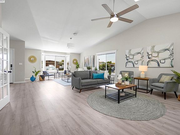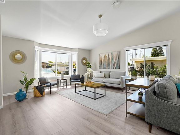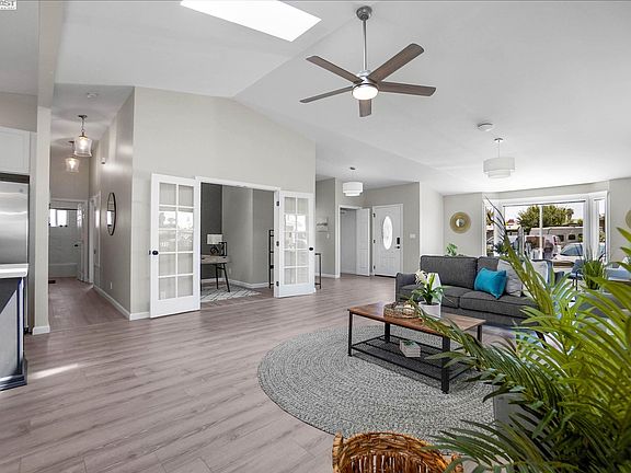 Remarkable east-facing, single-story home has been completely renovated with the latest trendy designs and materials! Open concept floor plan has vaulted ceilings, which enhances the spacious ambiance you'll discover here. Remodeled kitchen features an island breakfast bar, quartz counters, all Stainless Steel appliances and a pantry closet. En-suite primary bedroom boasts a walk-in closet. Brand new luxury waterproof laminate flooring throughout, and the neutral color palette will allow you to easily decorate to your own style. The dedicated office is perfect to get your work or studying done! Central heating and air conditioning provide year-round interior comfort. With dual pane windows and skylights, there is plenty of natural sunlight streaming in during the day; and an abundance of recessed lighting and overhead lighting to ensure brightness at night time too and all are ready to be connected with an Alexa device. Indoor laundry room, covered deck, and be sure to check out the detached "shed" = it's perfect to use as a workout room, art studio, kids' playhouse or home theater! The backyard is also lined with many mature fruit trees! All this, AND an unbeatable location that is near freeway & bridge entrances, public transportation, parks, schools, shopping, restaurants.