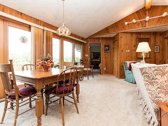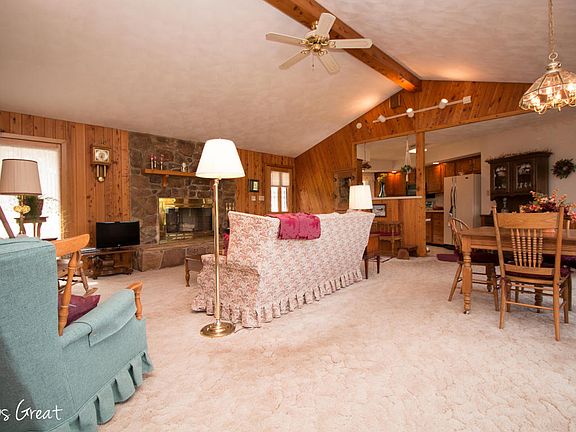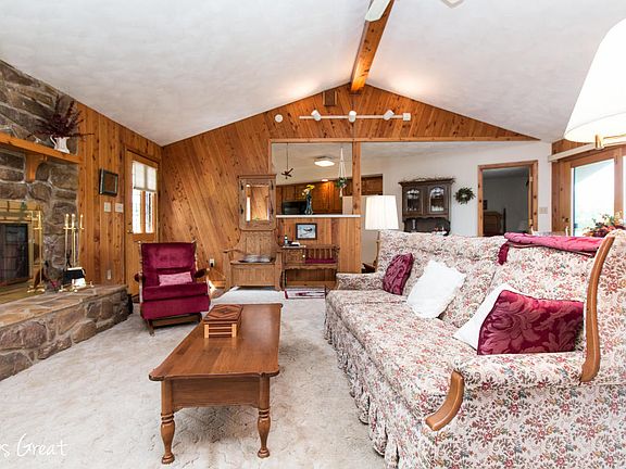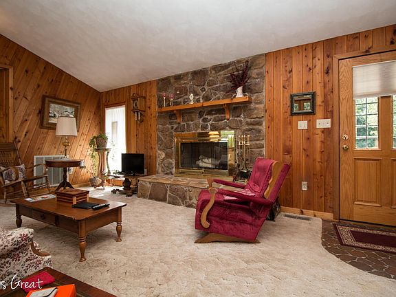 Great location! Nice contemporary house with Cedar interior walls, vaulted ceiling great room with fireplace. 3 BD/3BA with walk-in closets. Several French Doors provide views & access to the expansive deck. Nice finished walkout basement with wood stove, 3rd bedroom & bath, plenty of storage. Over 4 acres, with a stream in the back & plenty of privacy. New roof 2003, heat pump & air handle 2007. Priced below Assessed Value.