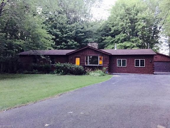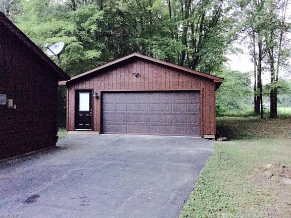 Enjoy privacy and nature with city utilities. Rustic log home in Lordstown Village has 3 bedrooms and two full baths. Great room with vaulted ceilings and exposed beams also a floor to ceiling two sided stone fireplace with natural log mantels. All new hickory kitchen with dining area also has vaulted ceiling. Dining area has sliding door to screened in rear porch that looks out to the wooded rear yard. New hickory style laminate floor ing throughout great room, kitchen, dining, hall and both baths. Master bedroom with attached totally remodeled master bath has modern double sink/vanity and large tile walk in shower with double shower heads. 24x32 Detached pole garage built in 2004 has double door in front and single door in the rear. All lighting fixtures, plumbing, plumbing fixtures, kitchen and bath, Central Air, HWT, electrical service line to garage are all new. New meter pit installed at street.