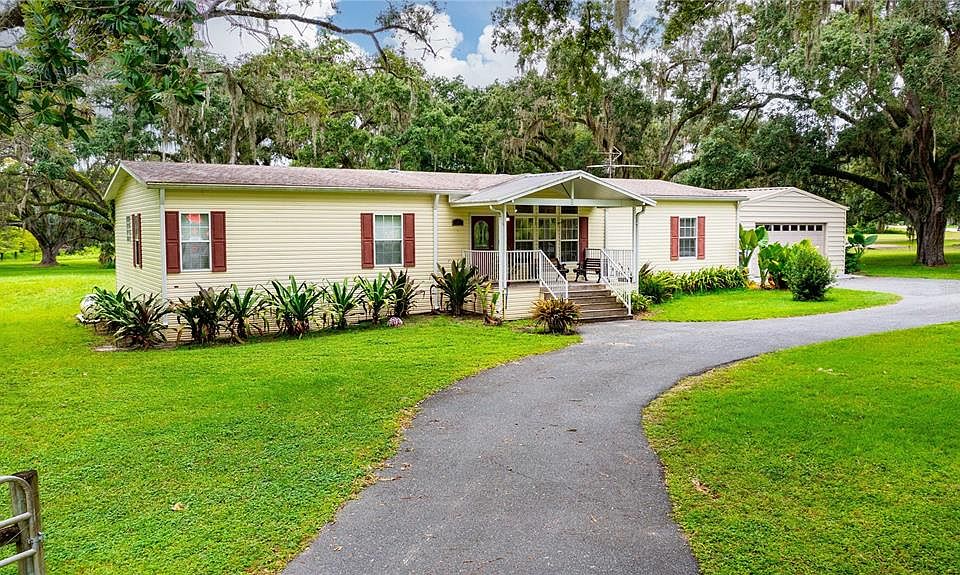 BACK ON THE MARKET - A 2012 JACOBSEN HOME located on an oversized corner lot with a large paved driveway. This beautiful manufactured home has 3 bedrooms, 2 full baths and a bonus room/office off of the master suite. The upgrades in this home include tile trim countertop, wood look cabinets, and so much more. A spacious split floor plan with over 2000 square feet of living space. The oversized living/dining room is perfect for friend and family gatherings. The kitchen features bar top and a large laundry room. Go out onto the 12x24 covered porch that overlooks the yard with access to the pond, perfect for fishing. Finally a 2 car detached garage/shop for all of the toys. It is located close to I-75, Old Pasco Rd and of course Bellamy Brothers. SO MANY OPTIONS.