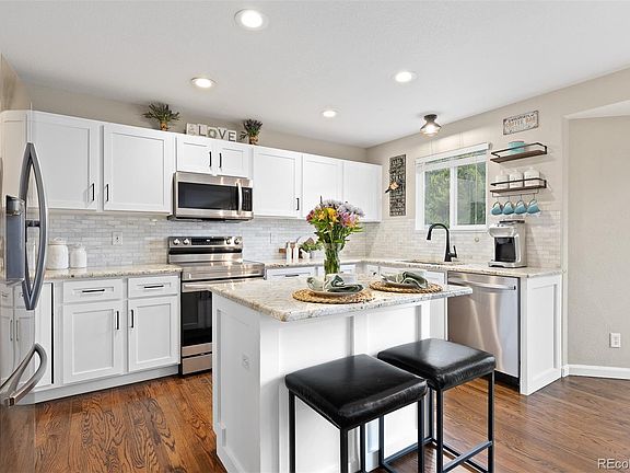 Welcome to this beautifully updated two-story home in the desirable Willow Run neighborhood of Broomfield! This home is as stylish as it is comfortable. Step inside to find a bright and open formal living room, perfect for entertaining. The updated kitchen offers wood floors, a great island, granite countertops & backsplash, and all included appliances. It flows seamlessly into the dining area and cozy family room with a fireplace—ideal for everyday living and gatherings alike. Upstairs, you’ll find 4 spacious bedrooms, including a primary suite with a walk-in closet and en-suite bathroom featuring a double-sink vanity. The three additional bedrooms share an updated full bathroom. Milgard windows upstairs provide energy efficiency and natural light. The finished basement offers flexible space that can be used as a 5th bedroom, guest area, or home office, complete with its own 3/4 bath. Comfort is a given with a new AC unit and a newer 50-gallon water heater. Additional highlights include a two-car garage—with the garage fridge included—and a convenient main-level laundry area with washer and dryer that stay. The home is south-facing, so snow melts quickly in the winter. Step out back to a private yard with a great patio space, fire pit area, new landscaping and a playground set that stays. Easy access to the Academy of Charter Schools! Don’t miss this move-in ready gem in a fantastic location close to parks, schools, and shopping!