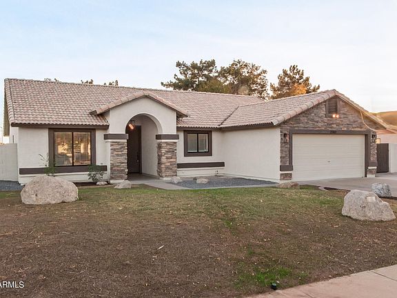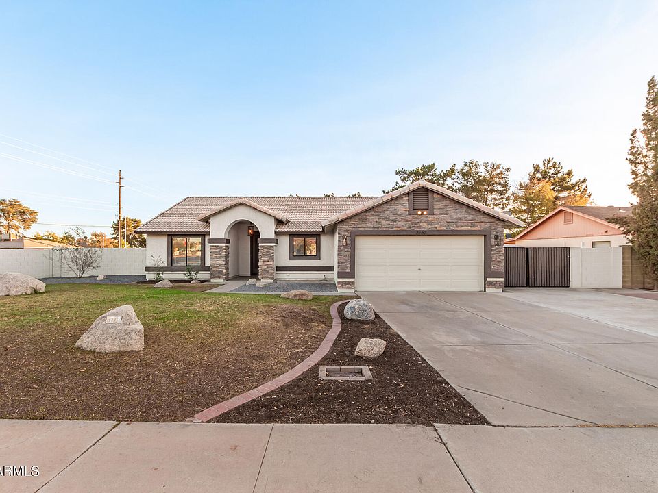 Welcome home! This 3-bed, 2-bath residence on a desirable corner lot is the one! Excellent curb appeal featuring a 2-car garage, an extended driveway, an RV gate, and a charming stone-accented facade. Discover an open layout showcasing vaulted ceilings, a soothing palette, and wood flooring. The kitchen boasts quartz countertops, white shaker cabinets, SS appliances, recessed lighting, and a stylish tile backsplash. The main bedroom offers direct backyard access, a walk-in closet, and a private bathroom with dual sinks. You'll love the beautiful backyard displaying a covered patio and natural turf, perfect for outdoor activities. Conveniently located near parks, schools, dining, and shopping. Don't miss out on this one!