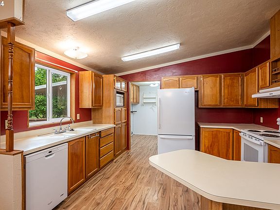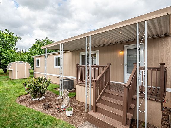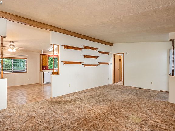 Light bright and move-in ready! Exceptional location with end of the road privacy and the beauty of a Filbert orchard as a neighbor. Wonderfully maintained MFH with the same owners for over 30 years. 2 carports, 2 sheds and a heat pump.