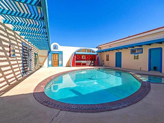 Unique opportunity to own a custom hacienda located in the gated community of Borrego Air Ranch with private registered runway. This fixer upper has great bones and features 2025 square feet of living space, enclosed courtyard with sparkling pool and built in kitchen, attached 2 car garage with dark room for the photographer in your family, large airplane hangar with additional 4 car garage, owned solar - all on a large 1.18 acre lot. Tranquil and quiet setting with beautiful views of the desert and surrounding mountains. Motivated seller - sold AS IS!