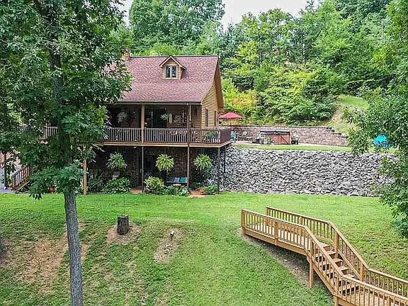 This expansive hillside property covers approx. 3.5 acres with a heavenly year round view of Barkley Lake. The home has 3 bedrooms, 2.5 baths on multiple levels. The cedar siding & rock front covered porches allows perfect seating on both levels, with a concrete and asphalt drive, leading to the hot tub under the stars. The 2 car attached garage allows for easy access to the lower level. The home is equipped w/ a whole house natural gas generator and new heat and air unit. There is a separate rental with 1000 sq ft that has one bedroom one bath with a attached garage. and a camper site with water, electric and septic. There is also a large storage building 24 x 50 with concrete floor, electric and 2- carport for boat storage.