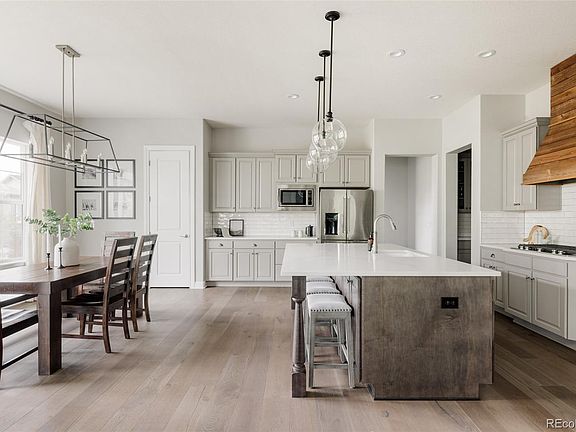 Nestled between Southshore’s two private resort-style clubhouses and pools and located in the award-winning Cherry Creek School District, this luxury Toll Brothers residence blends elevated design, functional layout, and curated upgrades. A grand two-story foyer welcomes you with soaring ceilings and high-end designer finishes. The main floor office offers a quiet workspace, while the formal dining room connects to the chef’s kitchen via a stylish pantry with built-in beverage fridge—perfect for entertaining. The open-concept great room features two-story ceilings, walls of natural light, and a custom fireplace with built-in bench seating. Stacked sliding doors open to your private backyard retreat—professionally landscaped with an extended covered patio, built-in grill, gas fire pit, custom paver patio, and mature trees—ideal for year-round indoor-outdoor living. The chef’s kitchen boasts soft-close cabinetry, high-end quartz countertops, a custom chimney-style hood, designer tile backsplash, large island, walk-in pantry, and gas range. A private main floor guest suite with full bath and walk-in closet is ideal for multi-gen living. The custom tile mudroom with built-ins leads to the oversized 3-car garage. Upstairs, a spacious loft offers built-in cabinetry, and the primary suite features a spa bath with expanded glass shower, soaking tub, dual vanities, and two walk-in closets. Two more bedrooms share a Jack-and-Jill bath, each with walk-in closets. A convenient upstairs laundry completes the level. The finished basement offers a large rec room, wet bar, game area, gym, guest bedroom, full bath, and storage. Just minutes from the Aurora Reservoir, trails, and lakeside amenities—this home defines Colorado luxury living.
