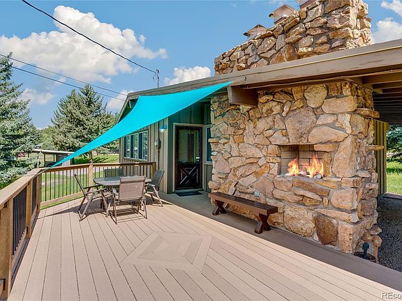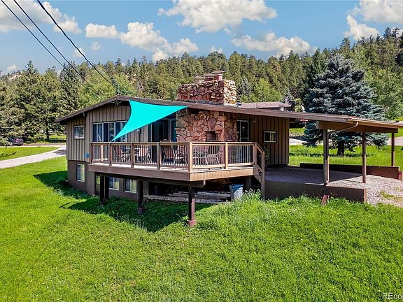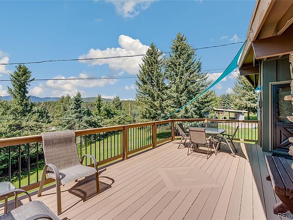 Incredible opportunity to own this ranch-style home in a desirable Evergreen location with striking mountain views. Enjoy being only minutes to charming downtown Evergreen with quaint shops and great dining, and to Evergreen Lake with trails to explore, picnic tables, paddle boarding & kayak rentals and the ever so popular winter ice skating with hot chocolate from the warming hut! Located on just over 1/3 of acre on a prime sloped corner lot, this ranch-style home offers tranquil mountain views and frequent deer & elk visitors. Inside, a spacious and functional layout awaits, enhanced with great natural light and endless views! The living room features vaulted ceilings and three large windows looking out onto the mountains beyond! A cozy, wood-burning fireplace with natural stone anchors the dining room, while the kitchen flows seamlessly. Easily bring in groceries from the sliding door off the kitchen from the covered carport. Two main-level bedrooms share a Jack-in-Jill full bath, with the primary having its own sink with vanity. More living space found in the fully finished walk-out basement with garden-level windows to bring in great natural light. An extensive family room with the home’s 2nd fireplace is the perfect spot for entertaining large gatherings, and two additional bedrooms with nearby ¾ bath is ideal for privacy. Relax after a long day on the large composite deck with serene mountains as your backdrop and twinkling nighttime skies in the evening! This is mountain living at its best, yet just a few minutes from town and quick access to Red Rocks, Denver & ski resorts.