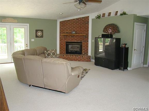 Spacious 5 BR, 3 Bath ranch home just under 4200 sq ft on 3 acres of land. Main floor is almost 2100 sq ft with 3 BR. Private large master suite has Master bath with jacuzzi tub, double vanity and shower. Very open floor plan with a large living room that has a cozy brick gas fireplace. Vaulted ceiling throughout the main living space. The walkout basement has 2 large bedrooms, large rec room with beautiful stone gas fireplace, full bath and a laundry room. Large deck overlooks wooded area. If you're looking for a house with lots of room for family or entertaining, this is the perfect home. Subdivision has 2 large ponds for fishing, pavilion with charcoal grill and tennis courts. Roads are state maintained. Within 2 miles of I-64. Convenient drive to Richmond or Charlottesville.