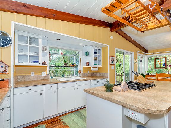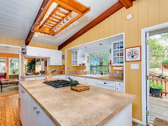 UPDATED MID-CENTURY LODGE STYLE w/views & special ambiance. Spacious Great Rooms w/sacred feel. ICONIC Open Beamed Ceilings. Master on main w/guest bedroom/office. Lodge Style Greatroom. Familyroom on Main. Media Room. 5 Bedrms, or Office /Studio w/ entrance. Restored Travertine, Floors, Windows, Roof, Insulation. PRECIOUS.35 acre location embraced by the spirit of the Pacific NW. 18 fruit trees & gardens. Palisades Heights. LakeBoat