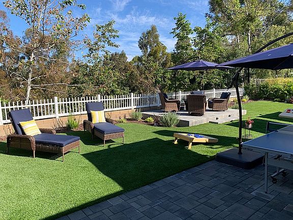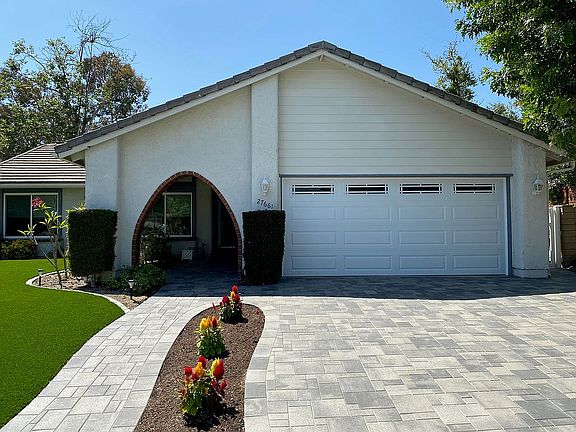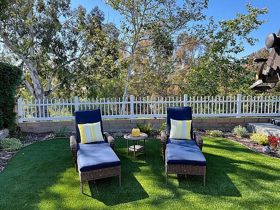 This magnificent single story ranch style home has upgraded concrete paver driveway and entry leading to a covered double door entrance. The large backyard consists of a concrete paver patio with built-in barbeque. There is also a raised concrete paver deck with firepit overlooking the Oso Viejo Park greenbelt and walking trails. The home is protected by a Ring security system with night vision cameras and motion sensor flood lights. On the inside you’ll find wood floors throughout the living area with tile in kitchen and baths. The kitchen has elegant white wood cabinetry, quartz countertop, colorful glass backsplash and Samsung stainless steel appliances. There are vaulted ceilings with recessed lighting. Light, bright and energy efficient the home has double pane sliding glass windows and patio door. Floor to ceiling brick fireplace with mantel.