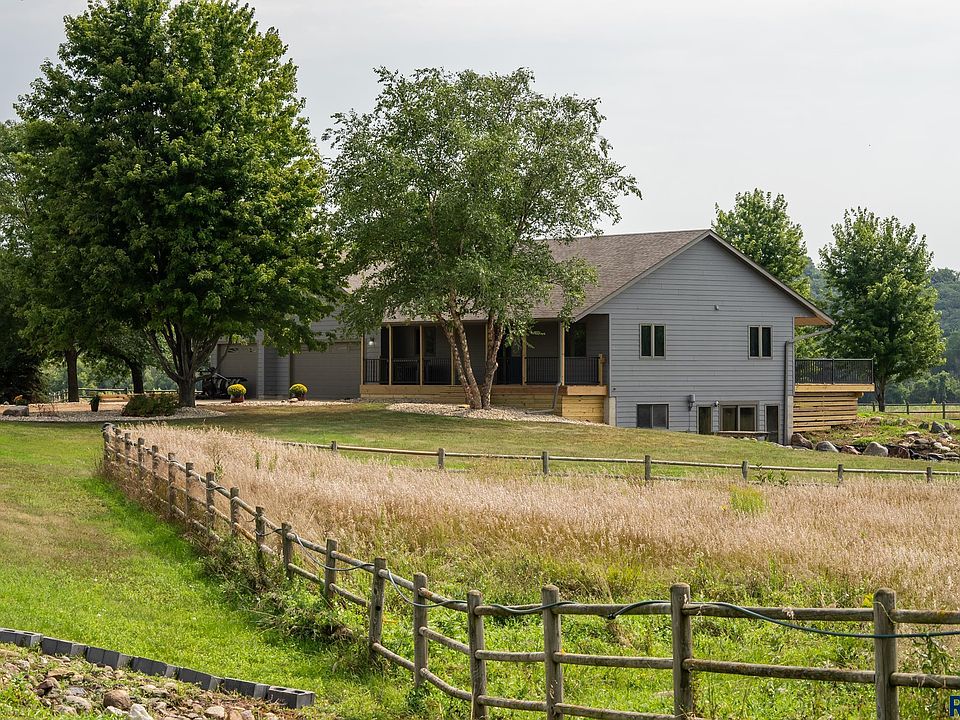 Discover the ultimate in country living with this striking 3,100 square foot ranch-style home, beautifully situated in a serene and pastoral setting on 21 acres. Schedule your sunrise or sunset viewing today! Surrounded by fenced pastures and mature trees, this property seamlessly blends natural beauty with modern comforts. The spacious interior features a vaulted living room with a cozy fireplace, an inviting dining area, and a well-appointed kitchen. The home also includes a dedicated guest wing and a private owner’s retreat, with a conveniently located laundry area between the oversized 3 stall attached heated garage and the owner's suite.