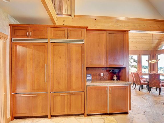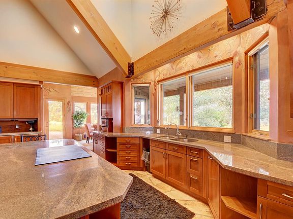 Amazing custom home with high end finishes throughout. Open floor plan for easy entertaining. The kitchen boasts two built in refrigerators, double ovens, wine frig, 10 foot island with cooktop, walk in pantry, granite counters and more. Flagstone floors with radiant hot water heat. Most rooms have dramatic vaulted ceilings. Lots of built in cabinets in the main floor office, master bedroom, sunroom and utility room. Terrific amount of storage. All main floor living except for the three upstairs bedrooms that are all en suite. Incredible views of the city from most windows in the home. 35 acres largely in knee high grass with usable terrain. The outdoor patios have blooming flowers all summer long. Covered patio with a built in grill plus another large patio area in back. Detached shop is 36 x 23 and has 9 ft ceilings. Caretakers 1 bedroom apt with a full bath and a three stall barn that has been converted to a dance hall with a small kitchen and 1/2 bath. Situated in Red School Ranch.