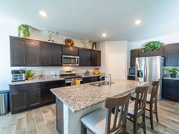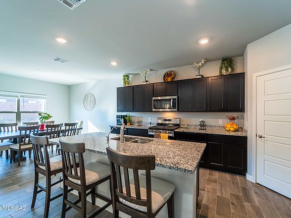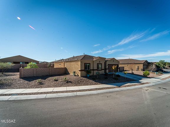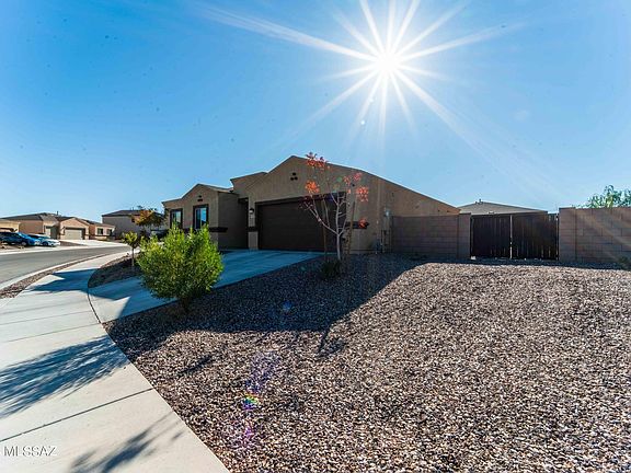 Short term rentals allowed. Like new 3BD/2BA contemporary DR Horton home in Tres Pueblos, built 2021, all ready for you to move in. Open greatroom floor plan with spacious family room & dining areas, recessed lighting. Kitchen features granite counters, island, breakfast bar, stainless appliances including gas stove and plenty of cabinet space. Primary bedroom has large walk in closet & en suite, dual vanity and shower. Spacious backyard with double gate and covered patio. Low HOA fees. Neighborhood playground and walking paths. Convenient to schools, shopping, I-10, Raytheon & Davis Monthan AFB. Come and take a look today!