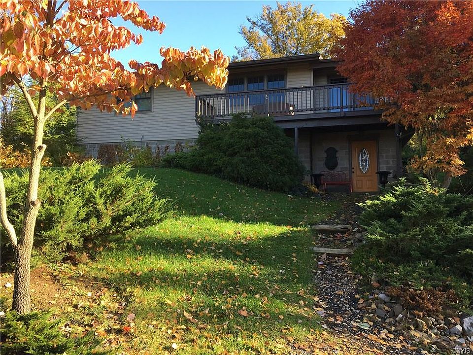 craftsman style ranch with vaulted ceiling, large beams, red oak trim around Anderson architectural series french door and windows on a very private and nicelly landscaped property with a tremendous view.