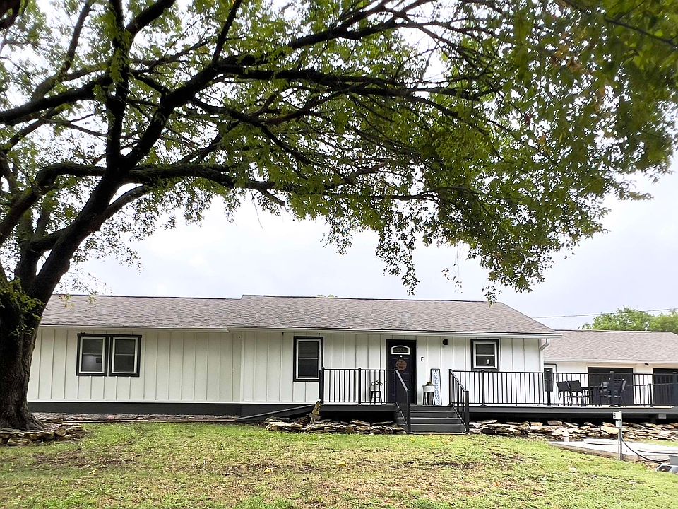 Less than five minutes from town, this beautifully remodeled ranch style home sits on just over 3 acres of green grass, mature trees and unmatched privacy. Step inside to an oversize living room and dining area that provides the perfect great room for gatherings or just a simple movie night. The master bedroom is large enough for a Setting area and has a private door that leads to a covered patio. The second bedroom offers generous space as well and a hidden Murphy closet. The bathroom is a good size and provides comfort and functionality. Kitchen features are granite countertops, beautiful tile floors and convenient access to the laundry room just around the corner. From there a back door opens onto a large Trex-deck – ideal for outdoor entertaining, grilling or simply enjoying the peaceful surroundings. For those who love a great garage you won't be disappointed. This insulated two car garage is equipped with central heat and air, epoxy floors great lighting, skylights and a stainless steel workbench. Room to work on your cars and watch Sunday Night Football!!! If you've been waiting for a pack your bags, move-in ready kind of place........ This is It!!!!