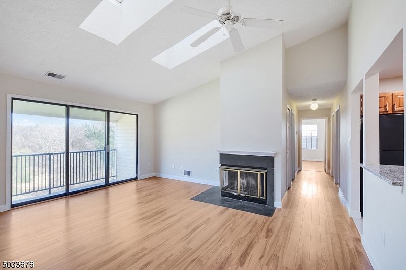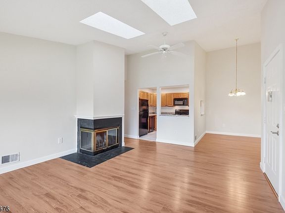 Welcome to this nicely updated top-floor end unit in Society Hill! This 2-bedroom, 2-bathroom home features high ceilings and skylights, filling the space with abundant natural light and serene private views. The updated kitchen showcases granite countertops, a stylish subway tile backsplash, and modern tile flooring. Wood-like floors throughout add warmth and appeal. Enjoy the living room with wood burning fire place or step out onto the deck to take in picturesque nature views. The master suite includes a spacious walk-in closet and a private bath for your comfort and privacy. The second bedroom features a double closet with organizing shelves, and the hallway bath across offers added convenience for your guests. Enjoy the convenience of an updated washer dryer in the utility room. This unit is ideally located near shopping, restaurants, and I-78, within a manicured 43-acre community near Pleasant Valley Park. Enjoy amenities, clubhouse, in-ground pool, tennis courts, bocce court, basketball court, and bicycle paths. Assigned parking is included, with plenty of additional parking available. Excellent Bernards Twp. schools.