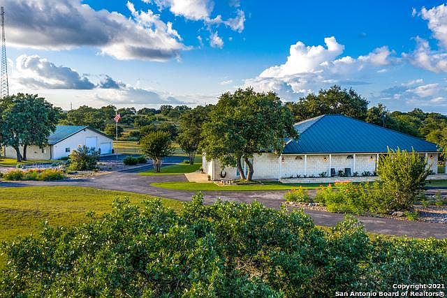 Immaculate well-appointed custom 1-story home on 9.99 fully fenced beautiful, well landscaped acres (3-ac are high fenced). Fantastic location convenient to popular Hill Country wineries & easy commute to Austin & San Antonio! Attractive entrance w/electric gate. Spacious covered front porch & impressive, screened back porch. Plus, screened party pavilion. Beautiful kitchen w/giant island & granite counter tops, well-built cabinets, stainless steel appliances; double ovens, built-in microwave & trash compactor. Includes R/O system, Kinetico water softener & built in Scottsman icemaker! Nice family room w/wood burning fireplace, stepped ceiling, adjacent to 2 large dining areas! Split master w/private office, 2-walk in closets, separate vanities, garden tub & nice walk-in shower! Secondary bedrooms each have full private bathroom! Oversized attached garage plus an incredible 58' x 44' engineered & well insulated metal workshop w/additional 2bd/1ba air conditioned & heated guest quarters, also includes inside RV connection w/dump station. Plenty of parking & convenient circular asphalt driveway & plenty parking near home & workshop. Additional features include a giant laundry room w/sink & half bath. This home is incredible and will not disappoint!