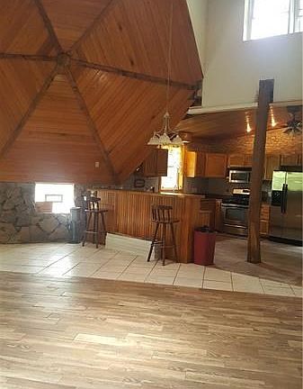 This unique Hexadome Log custom built home in a very secluded area.. The home has an open concept and built with 2x6 construction.. Two bedroom, one bath, Living room featuring a cozy wood burning stove and cathedral ceilings, The kitchen has all stainless steel appliances and a huge breakfast bar, dining room area off of living room. Radiant heated ceramic tile through out the home. All nestled on 2+/- acres with two sheds, conveniently located to Seven Springs, Hidden Valley, Fallingwater, Ohiopyle, Nemacolin & many more attractions.