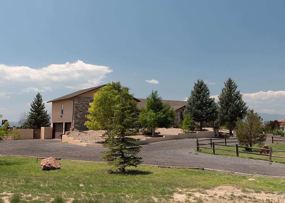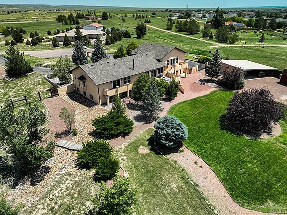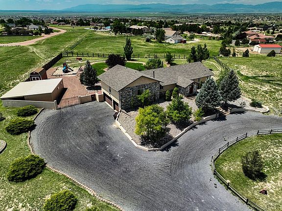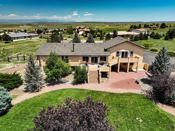 Most incredible home & lot you'll see all year! 2.39-acre lot located at the end of the cul-de-sac w/circular driveway, unobstructed views of the front range & Pikes Peak from the front of the home & Pueblo Reservoir & mountain range from the back. Large open concept w/marble floors, marble tile gas fireplace, vaulted ceilings, & new neutral light grey paint. Kitchen boasts granite countertops, new 6 burner gas stove w/new vent fan, new double oven, new microwave, Extra-large pantry has hookups for stackable washer dryer & can be used as a main level laundry. Large Trex deck for outdoor dining. Master bedroom w/large sitting area, sliding glass doors to the back deck & a nice window seat! Spa-like remodeled master bath w/jetted tub & walk-in shower. Huge extra family rm/2nd master bedroom with 3/4 bath. Dedicated main level office! Downstairs 2nd master suite with attached full bath that has been remodeled with double sinks & jetted tub! Large laundry area and tons of storage. This home has all the upgrades: new class 4 roof w/Duration hail impact shingles, new storage barn, new children's playground, new AC! Newer carpet downstairs, all newer windows & doors, (2) forced-air gas furnaces. Oversized 3 car attached painted garage w/oversized doors that has two entrances into the home; one from the main level a one from the basement level. Huge oversized carport could fit up to 6 cars!