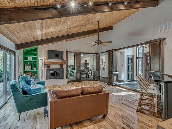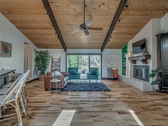 With a Mid-Century flair, this immaculate estate brick and cedar siding home immediately ushers you into a welcoming entry and warm great room overlooking a densely wooded acreage and saltwater pool. Wood ceiling, large wood-burning fireplace, and eat-in kitchen evoke the essence of cottage vibes while large sliding doors allow the covered outdoor space to become an extension of the room. The owner's suite boasts a beautiful en suite bathroom oasis with a private exercise/yoga room and rear deck with views of the wooded backyard. A large working studio with a private side entrance allows any buyer the flexibility of making the space their own. Don't forget to check out the backyard rock bridge and fire-pit. Home features include Geothermal HVAC, Phillips hue smart lighting, solatube lighting throughout, Hardwood Flooring, Custom Cabinetry, lush landscaping, spray-foam insulation, Low-e windows.