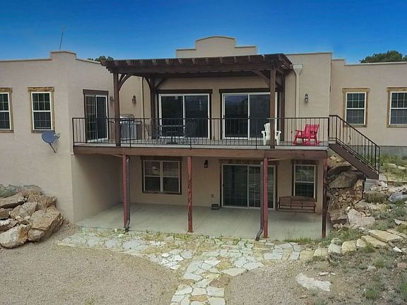 With a southwestern design & earth-tone stucco, this "tucked-away treasure" is move-in ready. Upon entering the home, you are instantly drawn to the glass doors to the upper-level deck; there you have views of the pinion, juniper & moss rock-studded property & stunning, wide angle views of the Sangre de Cristo Mtns. Nice floor plan with living, dining & kitchen all open with a large breakfast bar separating the kitchen area. Living & dining area have hickory flooring, & tongue and groove ceiling. A fireplace with log trim & mantle adds to the comfy feel of this area. Kitchen has granite tile countertops, light hickory cabinetry, pantry, tile flooring, & entry to the attached 2 car garage. Master bedroom has mountain views, doors to deck, walk-in closet; the bath has separate double sinks, walk-in shower, tiled floor, linen closet, & jacuzzi tub. This main floor also includes 2 guest bedroom, full bath, laundry room & storage closet. A 1020 SF finished walk-out basement includes living/TV/entertainment area, a nice corner spot for deck/home office, full bath, equipment/storage room. Sliding glass doors to lower-level stone walkway, patio, & outdoor fire pit.