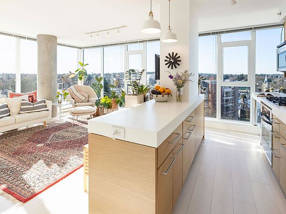 ONE OF A KIND HOME IN THE HEART OF MOUNT PLEASANT! Nothing to do but move in & enjoy over 800 sqft of functional living space in this oversized 1 bed + den at Stella - steps to the best restaurants, community centre & transit. You'll love the floor to ceiling windows throughout this incredibly bright South East CORNER home, complete w/ chef's kitchen, gas range & huge island; perfect for entertaining guests! Take in the city lights & enjoy VIEWS of Metrotown & the mountains on your spacious & private balcony. Large den boasts custom built-ins, perfect for your home office needs & primary bedroom w/ spa inspired bathroom is separated from your living space. Tons of storage throughout including the most welcoming entryway. 1 parking included. Our pleasure to show!