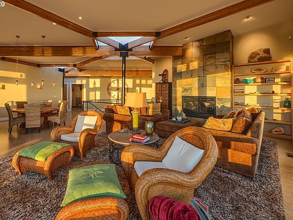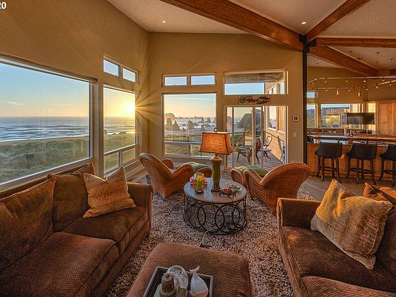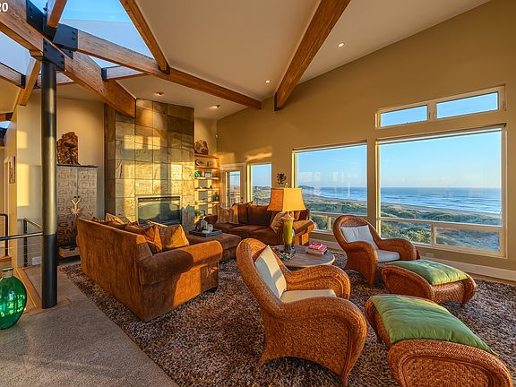 Oceanfront Beyond Comparison. Tucked in an exclusive, gated community, the home is of contemporary design, with spacious rooms that flow easily from one to another. Tall ceilings and large windows capture the extraordinary views, nearly 180 degrees up and down the coastline. Each room has a private balcony or patio. Attention to detail is first class. Best of all: your very own stairs to the welcoming beach, sea stacks and ocean below, and an experience with nature that will rejuvenate the soul.