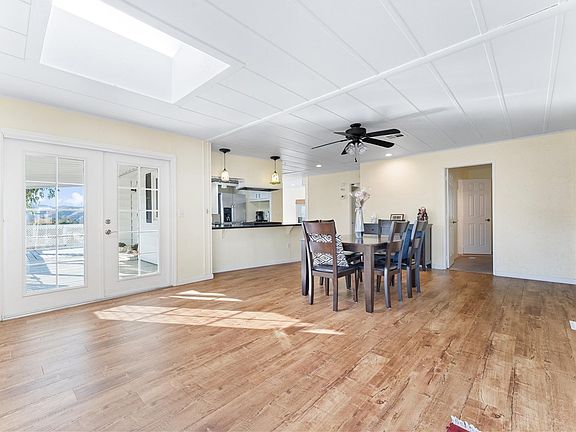 A spacious and updated kitchen boasts a functional and modern design, featuring a skylight, stainless steel appliances, and a large island with eating counter, and plenty of cabinetry for a neat cooking space. Milgard windows throughout, replaced skylights, wood laminate flooring. Updated bathrooms with high-end finishes. Custom fireplace for those cozy evenings. Open floor plan including a built in china/display cabinet off of the living area adds to the home's charm. **BREATHTAKING VIEWS** make this one of the most sought after spots in the park. Carport and storage shed. Low land lease at $956 month and under Rent Control.