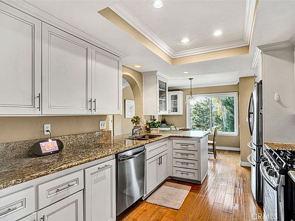 Live the Good Life on Lake Mission Viejo with this Beautiful Mallorca Home! This 2 bedroom and 2 bathroom home with amazing views of the lake will make you feel like you are living in a resort everyday! The home boasts endless upgrades including a remodeled kitchen, remodeled bathrooms, dual-paned windows and sliders, Plantation shutters, remodeled stone fireplace, built-ins, crown molding, beautiful flooring and more! The entry is highly desirable with only 3 steps up into the front door that opens to beautiful views to the lake. The gorgeous remodeled kitchen is light and bright and includes granite counter tops, stainless steel appliances, elegant wood cabinets with glass doors, a coffee station and a kitchen nook area with perfect views. The kitchen opens to the living room and family room with a cozy fireplace and two large sliders that open to the spacious balcony perfect for relaxing after a busy day. The views from the balcony will make you never want to leave! The primary bedroom is extra large with a gorgeous view of the lake, a spacious primary bathroom and a huge closet area. The primary bathroom includes dual sinks, stone counter tops, wood cabinets and a walk-in stone shower. The secondary bedroom is currently used as an office but includes a Murphy bed and storage great for transitioning to a bedroom when needed. The secondary bath is also upgraded with wood cabinets, stone counter top and a remodeled bath/shower combo. This home also includes an inside laundry closet with storage and a two car detached garage very close to the home. The resort-style amenities of the Mallorcas includes a 24 hour guard at the front gate, two pools, two spas, beautifully maintained landscaping, walkways all around the community and a private beach. The private beach is for Mallorca residents only and includes covered picnic areas, bbqs, racks for paddle boards/kayaks, community boat dock and limited private boat slips if you wish to have your own boat at the lake. Also included is a membership to the wonderful Lake Mission Viejo where you will enjoy two beaches, clubhouse, concerts, boat rentals, many other water rentals, fishing, sand volleyball, playground and swimming. Very close to wonderful lakefront restaurants, shops, gyms and more! You will definitely be Living the Good Life on Lake Mission Viejo! (Click onto the 360 icon under the map for the amazing drone video)