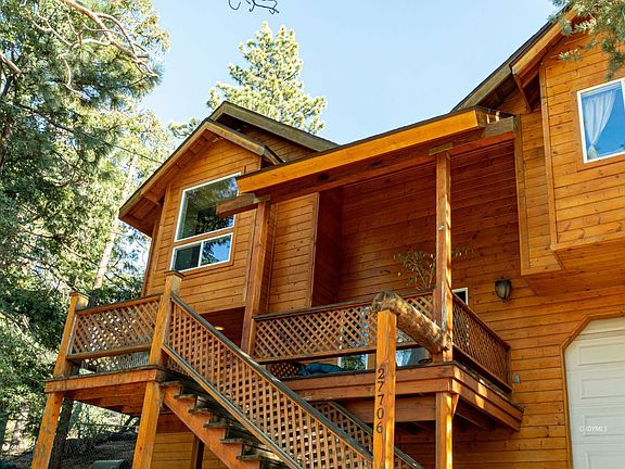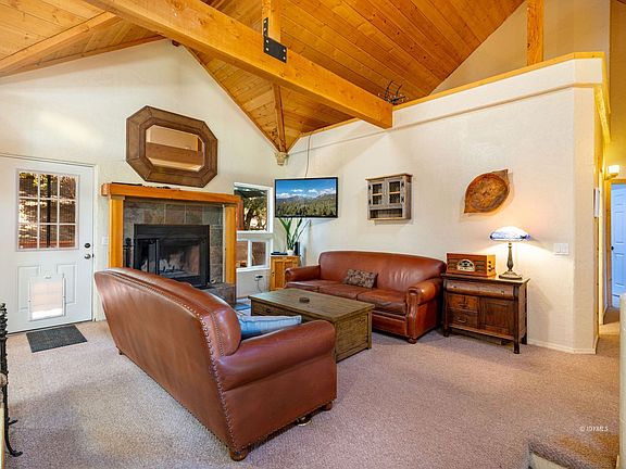 Where mountain cabin meets modern. The exterior gives a mountain lodge feeling while it has a more modern take on the interior. This cabin with knotty pine cathedral ceilings and tall light-colored walls gives a fresh and airy feel. Walk thru the front entrance door where an extra ample staircase greets you with a grand view of the high ceilings and exposed beams in the living space giving the big "wow" factor. Skylights throughout, and lovely large dual-paned windows allows the natural light in. The slate tile wood-burning fireplace provides heat and a warm inviting ambiance. Living room has a clear view of the dining room perfect for entertaining. Large updated kitchen has room for a breakfast nook or a perfect spot to place an office desk. The Master bedroom has an ensuite 3/4 bath with a large slate step-in shower and a private deck. All bedrooms have vaulted ceilings and spacious closets. Attached large 2-car garage. Partially fenced. Central Air conditioning and heating for your comfort. No HOA.