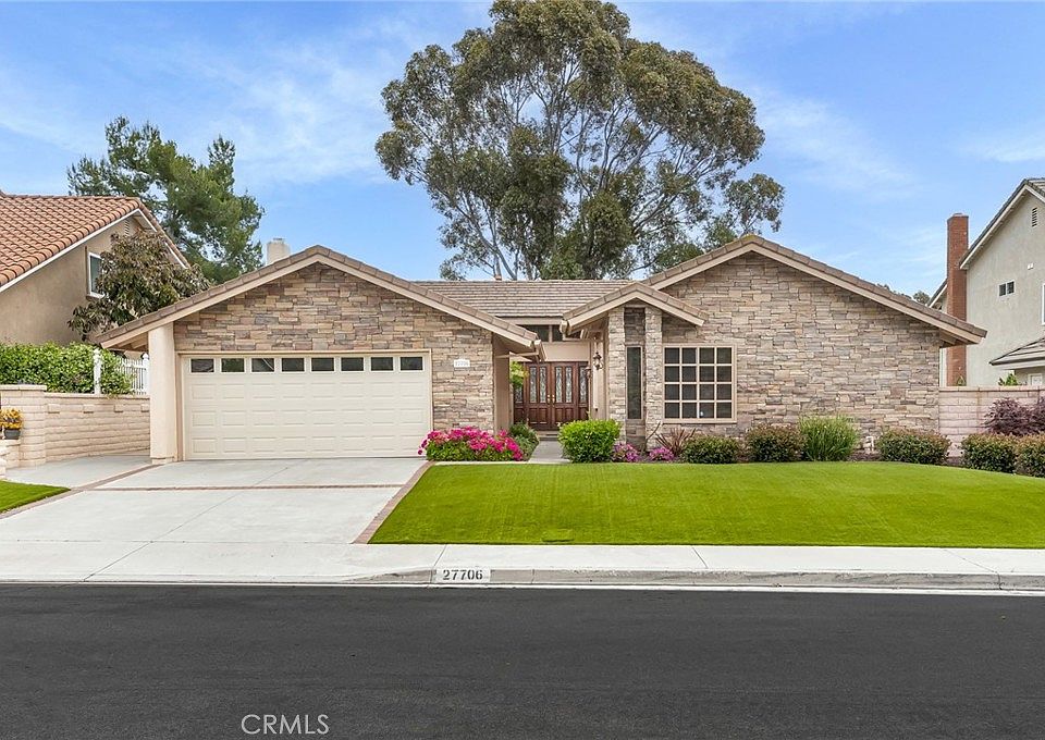Experience the joy of warm summer nights in this well-loved SINGLE-STORY home, where you can enjoy the SPECTACULAR Lake Mission Viejo summer FIREWORKS SHOWS right from your own backyard. Never before on the market, & is superbly located on a double CDS in the highly sought-after neighborhood, Madrid Del Lago. BONUS FEATURES include a full house RE-PIPE, Milgard sliding glass doors, synthetic turf, 4-ton AC & a vinyl patio cover. As you approach this home, you'll be greeted by picture-perfect curb appeal that instantly captivates the eye & a inviting private courtyard adorned with lush foliage creating a pleasant & welcoming ambiance. Upon entering, you will feel the openness of this 4-bedroom home with crown molding & high ceilings. The beautifully framed doors maximize the flow of natural light while providing clear views of the backyard, which is adorned with distant green trees, adding a touch of natural beauty & serenity to the home's ambiance. The spacious family room, complete with a cozy fireplace as its centerpiece, offers a comfortable retreat & seamlessly flows to the side yard for effortless indoor-outdoor entertaining. In this kitchen, you'll appreciate granite countertops, timeless white cabinets, recessed lighting, & window with pleasant views to the backyard, allowing you to enjoy the serene beauty of the outdoor scenery. The kitchen nook with a bay window is a delightful space that combines functionality & charm & invites natural light to cascade into the room. Bedroom #1 is ideal for a home office & overlooks the courtyard. The private primary suite is spacious offers a serene atmosphere. Pamper yourself in the en-suite bathroom, with dual sinks, an upgraded large soaking tub & shower, with a bonus storage/linen closet. Two ample mirrored closets & a vinyl sliding glass door allow for ease of access to the backyard. Down the hall, you'll discover 2 additional bedrooms, linen cabinets & a full bath. Escape to the low maintenance backyard, meticulously landscaped with colorful & vibrant roses, delicious lime & lemon trees, vinyl patio cover, & plenty of sitting areas to enjoy outdoor dining. Revel in the soothing sounds of the special water feature that splashes into the in-ground spa. Gather with friends around the fire pit or relax in the heated Spa. A perk of living in this community is you are instantly a member of Lake MV. Close to Plaza Del Lago, & in walking distance to parks, walking trails & more. There is no Mello Roos & low HOA.
