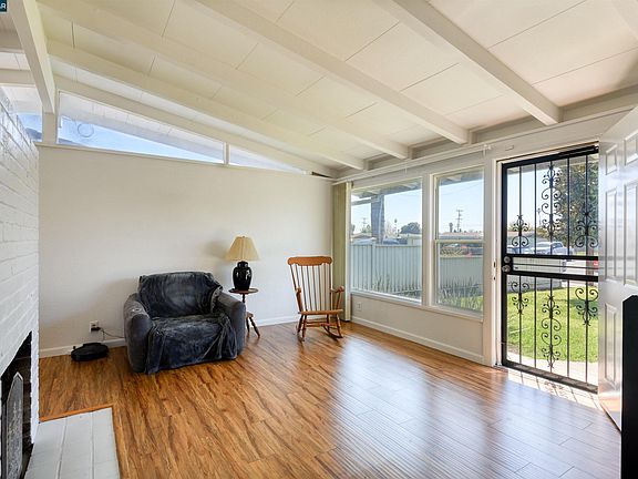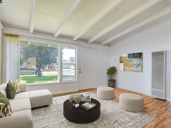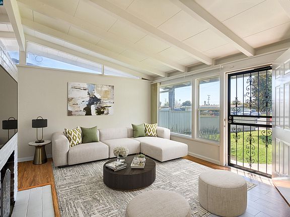 Welcome to this charming 3-bedroom, 2-bathroom, 1,110 sqft. single-family residence in Hayward's sought-after Palma Ceia neighborhood. Upon entering, you are greeted by the living room with high vaulted ceilings featuring exposed beams and a wood-burning fireplace, creating a warm atmosphere. The open floorplan seamlessly connects the living room, dining area, and kitchen, which boasts quartz countertops, stainless steel appliances, and a welcoming layout for gatherings. A large sliding glass door in the dining area leads to the backyard. The primary bedroom is spacious and filled with natural light, offering sliding glass doors for backyard access, an en suite bathroom, and a walk-in closet. Two additional bedrooms feature high beamed ceilings and share a full bathroom down the hall. Outside, the backyard is beautifully landscaped, boasting an above-ground hot tub and a wood fence for privacy. This home sits on a well-maintained lot with front and back yards, complemented by a two-car attached garage with laundry. Located in the Palma Ceia area of Hayward, this home offers comfort and style in a desirable neighborhood.