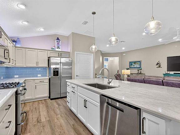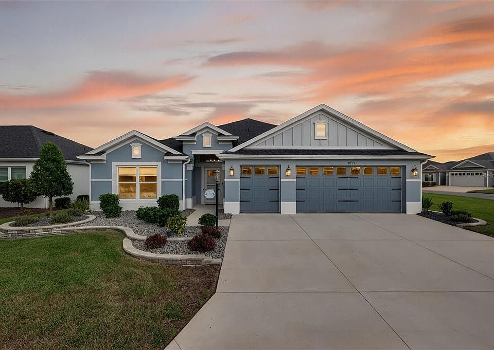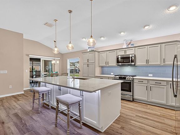 STUNNING, BLOCK and STUCCO 3/2 IRIS with GLASS ENCLOSED, CLIMATE-CONTROLLED LANAI and EXPANSIVE, OVERSIZED 618sf TWO CAR + GOLF CAR garage on LARGE CORNER LOT with ROOM FOR A POOL in the highly desirable Village of Richmond! JUST MINUTES from Brownwood Paddock Square! Built in 2022, this nearly NEW home offers LOW-MAINTENANCE peace of mind with MODERN DESIGN! Enhanced tiered hardscaping, stoned landscaping beds, and an entry door with large transom welcome you in to a well-lit and GENEROUS foyer boasting HIGH CEILINGS and a convenient ENTRY CLOSET. The EXPANSIVE open concept of the living, dining, and kitchen showcase GORGEOUS, WOOD-GRAIN LUXURY VINYL PLANK FLOORING and HIGH VAULTED CEILINGS creating a SPACIOUS and VOLUMINOUS main living area. From the living room, sliding glass doors invite you in to the 29’ x 13’, GLASS ENCLOSED, CLIMATE-CONTROLLED LANAI with MINI-SPLIT. This FABULOUS room is adorned with PLANK TILE FLOORS; FULL PANEL, TINTED sliding glass doors; SOLAR SHADES; and adds an IMPRESSIVE 377sf of BONUS living area to this MAGNIFICENT home! There’s also an adjacent REAR PATIO - perfect for grilling or enjoying the beautiful Florida weather! Back inside, the STUNNING kitchen is a CULINARY HAVEN boasting modern GLACIER GRAY SHAKER cabinetry; QUARTZ countertops; TILED backsplash; CENTER ISLAND with DOUBLE-SIDED cabinets and convenient EAT-IN breakfast bar; under and over CABINET LIGHTING; UPGRADED WIFI STAINLESS appliances with GAS, CONVECTION, and AIR FRYER cooking; and built-in DOUBLE PANTRY with ROLL-OUTS. Adjacent to the kitchen, the dining room, with its VAULTED ceiling and large window, invites NATURAL LIGHT and offers easy access to the lanai through sliding glass doors. The luxurious primary bedroom boasts a TRAY ceiling and a large WALK-IN closet with EXTENDED shelving. Its en-suite bathroom is a retreat in itself, featuring LVP flooring, VAULTED ceiling, SHAKER cabinetry, QUARTZ countertops, DOUBLE sinks, TILED WALK-IN shower, built-in LINEN closet, and separate water closet. Two additional bedrooms and a second bathroom are conveniently located behind a POCKET DOOR near the front of the home, ensuring plenty of PRIVACY for guests or a quiet home office. Bedrooms two and three both feature VAULTED ceilings and built-in closets for ample storage. The second bathroom is well-appointed with LVP floors, SHAKER vanity with QUARTZ countertop, a TILED WALK-IN shower, and a hallway LINEN closet. A CENTRALLY-LOCATED, INTERIOR laundry room offers LVP floors and SHAKER cabinetry for extra storage needs. The EXPANSIVE, OVERSIZED 28’ x 29’ TWO-CAR + GOLF CART GARAGE offers EPOXIED flooring, UNDER-AIR STORAGE closet, wall-mounted foldable table, pull-down stairs with attic access, and a UTILITY SINK with cabinets. DON’T MISS YOUR OPPORTUNITY to make this INCREDIBLE HOME YOUR OWN! The Village of Richmond is JUST MINUTES to Brownwood Paddock Square with shopping, restaurants, and nightly live entertainment; Richmond, Clarendon, and Lake Okahumpka Recreation Centers; Richmond Pitch and Putt; Water Lily Bridge; Hogeye Preserve; the new Harry and the Natives Restaurant; the ever popular Edna's on the Green; Sawgrass Grove; the up and coming Eastport Town Center; Magnolia shopping plaza; and SR 44 and CR 466a with a plethora of shopping, restaurants, banks, medical, and more! PLEASE WATCH OUR WALKTHROUGH VIDEO OF THIS EXCEPTIONAL HOME in a FANTASTIC LOCATION and call today to schedule your Private Showing or Virtual Tour!