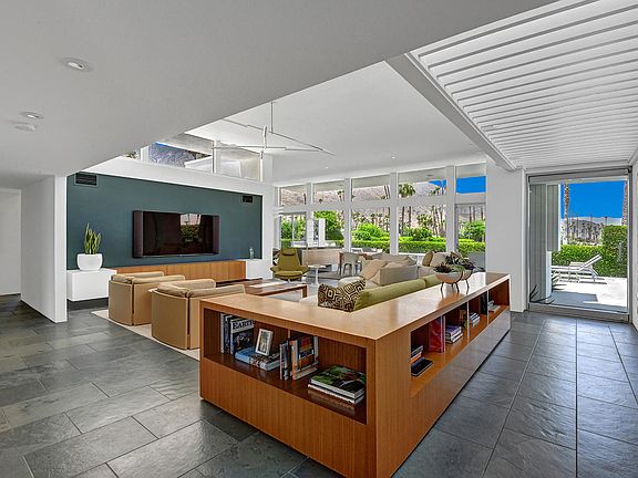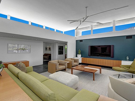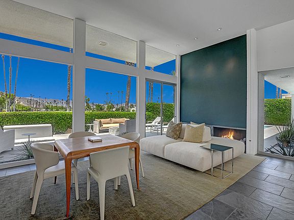 Famed architect William Krisel's design of this mid-century modern gem includes his signature high ceilings, 360° clerestory windows providing views in all directions, and slatted trellis entry luring you to the large back patio with private pool/spa, and unobstructed views to the stunning San Jacinto and San Bernardino Mtns. Inside this entertainer's dream, acclaimed interior designer Luis Ortega, designed each space, including the three en-suite bedrooms, with an emphasis on purity of form, function, comfort and quiet elegance, including the custom-designed bar for guests to gather around, and each of his thoughtfully selected furnishings from the likes of Cassina, Ralph Pucci, and Poltrona Frau, among others. The north/south orientation and cantilevered roof line of this exquisite home not only showcase the explosive views and provide sun protection, but also make this home one of the most desirable in the entire Indian Canyons neighborhood. The fully purchased solar system (9.24 kw), outdoor fire feature and shower, built-in sound system and finished garage simply add to the endless features of this amazing home.