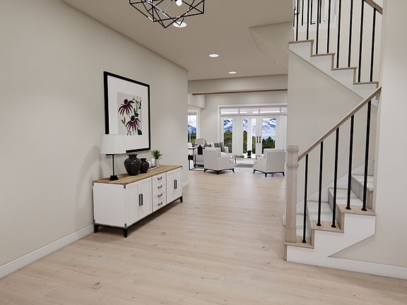 Welcome to your dream home in the heart of Mapleton-where thoughtful design meets timeless craftsmanship. 3D rendering link http://bit.ly/485gOzc This stunning 6-bedroom, 4.5-bathroom custom residence offers over 5,400 square feet of beautifully finished space, nestled on a flat 0.34-acre lot Large windows, 11' living room ceilings, and upgraded lighting throughout the home flood the space with natural light and warmth. The open-concept main level is anchored by a striking floor-to-ceiling stone fireplace and features white and navy cabinetry, brass hardware, and a custom wood hood vent that brings a designer touch to the gourmet kitchen. Entertain with ease around the oversized island, or flow effortlessly to the covered back patio-perfect for evenings enjoying the mountain views. The luxurious primary suite offers a soaking tub, separate shower, and a walk-in closet with a window bench. Every detail was considered-from wainscoting in the dining area to the built-in lockers in the mudroom for everyday ease. The fully finished basement includes a versatile 2-bed, 1-bath ADU with a full kitchen, private laundry, and separate entrance. Additional highlights include upgraded lighting, a covered back patio, and an oversized 3-car garage with an extended third bay. Photos are representative and depict a similar home. Renderings and floor plans are for illustrative purposes only and may not reflect the final product. Estimated completion date Feb 2026.