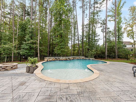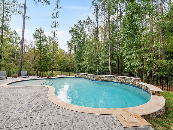 Located in the highly sought after Green Level corridor in Apex, this home checks all the boxes The home sits tucked away in the rear of a cul-de-sac and on a nicely landscaped, level lot. The home backs up to a naturally wooded buffer and is just steps away - and with direct access - to the White Oak Creek Greenway, which feeds into the American Tobacco Trail. 1st and 2nd level porches (1st level screened) overlook a backyard oasis consisting of a heated and cooled salt water swimming pool with tanning ledge, waterfall accents, expansive stamped concrete decking, fire pit area and a pergola covered outdoor kitchen with grill, side burners and refrigerator. Inside you'll find a gorgeous home with modern features, tall ceilings, an open layout and hardwoods or tile throughout (no carpeting). The large kitchen is finished with beautiful cabinetry, granite counter tops, tile backsplash, a huge island and walk-in panty and overlooks a family room with soaring 11' coffered ceilings and a fireplace encased in floor-to-ceiling stone. 1st floor guest bedroom with en-suite bath. The 2nd level consists of a a spacious primary suite with tray ceiling, direct access to the 2nd story screened porch, large closet and a gorgeous en-suite bath, bonus room, 3 secondary bedrooms and 2 full baths. The floored and pre-plumbed attic offers the ability to add additional finished square footage or endless storage options. Additional: roof mounted solar panels that generate approximately 13-14 MWh per year, finished security system, powered blinds in the bedrooms, sealed crawl space, 220V outlet in garage, wired for fiber Internet providers Spectrum, Google and/or At&t.