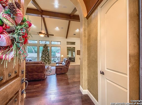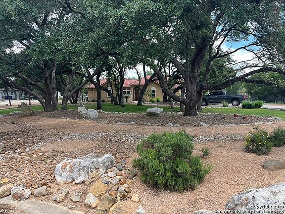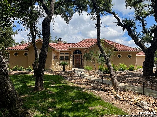 MEDITERRANEAN MASTERPIECE, COMPLETE WITH POOL, OUTDOOR KITCHEN AND THREE CAR GARAGE, OFFERS RESORT LIVING IN ONE OF THE MOST COVETED LUXURY NEIGHBORHOODS IN NEW BRAUNFELS! This is priced below COUNTY APPRAISAL! Sitting on 1.37 gorgeous acres, this single story custom, stucco villa with tile roof beckons from the street with gorgeous curb appeal. This home has so many smart built-ins and extras--where do we begin? The kitchen in a chef's dream with wrap around breakfast bar, custom wood cabinets, two full-sized sinks, five-burner cooktop, high end vent hood, insta-hot faucet, huge walk-in pantry, pull-outs (including spice racks & pot drawers) The master is fit for a queen with double trey ceiling, rock art niche and massive en-suite bathroom that features his and hers back to back vanities plus coffee/jewelry bar, gracious garden tub, and 6' by 5' walk-in custom tiled shower with rainhead and shower wand. The immense master closet offers built-ins and 20 feet of hang space! The secondary bedrooms on the other side of the home share a Jack and Jill bath while guests can use a powder room off the living space. It is easy to work out of this home with its office with built in desk and shelving. Your utility room features loads of room and includes a utility sink. The sunroom with full view of the lagoon-like pool and outdoor kitchen is the perfect cozy spot to visit friends or read a book. This home begs to be a year-round entertaining center from your game room with a bar, fridge, and pool table to your completely enclosed back courtyard you have your heated pool with built-in hot tub within easy reach of your outdoor kitchen with grill, bar and television. The flagstone deck adds a classy touch and plenty of sitting space for those not enjoying the water and an outdoor shower is an extra so hard to find. If this isn't enough already, step through your wrought iron gates and follow the path to an area perfect for a fire pit and hours of conversation. The garage is a dream full of surprises -- side entry, three-car and believe it or not the main bay easily fits a dually truck! Epoxy floors, tons of cabinets for storage, workbench for projects, utility sink and real stairs to a large attic space for easy storage. Behind the garage find the perfect man cave or workshop -- a golf-cart garage with roll-up door and full electricity.