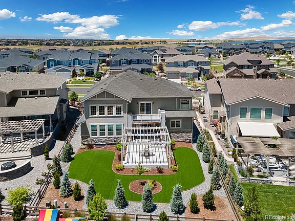 This luxury home has over $340K in upgrades! (Full list available in MLS supplements or upon request.) Experience the ultimate in living with this breathtaking, 4-bedroom, 4-bathroom home located in the desirable lakeside community of Southshore, & a 5-minute walk from the Aurora Reservoir trailhead. Enjoy custom upgrades, 9ft ceilings, exquisite finishes & LVP flooring throughout. The foyer has an admirable 2-story ceiling with custom lighting, elegant winding staircase, & connects to a private office with French doors, & a stone double-sided fireplace separating the formal dining & living rooms which could be used as flex spaces. The great room is impressive with its 18ft ceiling, 2-story stacked stone fireplace, ceiling fan & motorized window shades. The chef's dream kitchen is the heart of the home with Kitchen Aid appliances, oversized island, granite countertops, mosaic-style backsplash, custom cabinets, eat-in dining area, walk-in food pantry & separate serving pantry connecting to the dining room. The main level continues with a laundry room with custom cabinetry, mudroom, bath. Dual staircases lead to the second floor which opens to a loft & 3 additional bedrooms with 2 bathrooms. The exquisite primary suite features a peaceful walkout balcony with a view of the Aurora Reservoir. The primary bath features a custom-designed steam shower, dual vanities, & free-standing tub. Adjacent to the bath is a huge walk-in closet with built-in shelving & island. With its 9ft ceiling & 1400+ sqft semi-finished basement boasting carpet & rough-in plumbing, there is plenty of space to make it your own! The multi-panel stacking doors on the main level lead you to the gorgeous backyard with a view of the Aurora Reservoir & low maintenance landscaping that includes high quality artificial grass. With amazing amenities, lakeside views, trails, clubhouses & top-rated schools: you won’t want to miss out on this home! Home is located within the Altitude Elementary school district