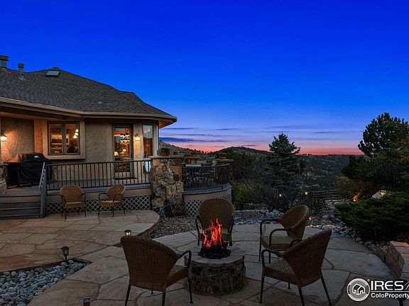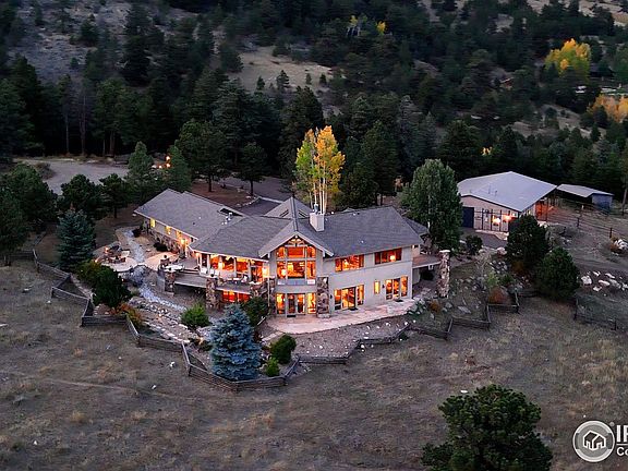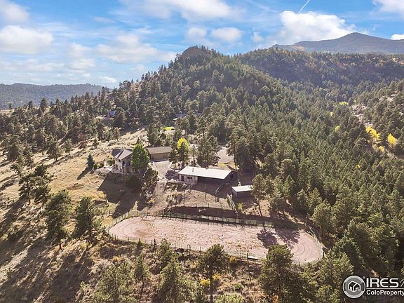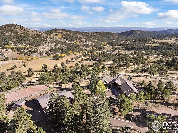 Welcome to The Full Circle Ranch, a luxurious 35-acre horse property with breathtaking views of the foothills and Denver skyline. Located on a bluff at the eastern edge of Golden Gate Canyon State Park, just 20 minutes from downtown Golden, this ranch offers both seclusion and convenience.The custom 1-story ranch-style home with a walkout basement is full of high-end details: vaulted ceilings, exposed timber beams, wrought iron railings, real rock walls, and hardwood floors. Unique touches include Idaho Quartzite Slate, unfilled travertine, and custom Knotty Alder cabinetry, all combining rustic charm with refined elegance.The primary suite is a private retreat with a gas fireplace, Jacuzzi jetted tub, steam shower, walk-in closet, and balcony. The great room features a fireplace and stunning views through floor-to-ceiling windows. The gourmet kitchen is equipped with a Sub-Zero fridge, Thermador range, Decor oven, and a large walk-in pantry. Additional features include a private study, mudroom/laundry room, two powder rooms, and a large deck with a flagstone patio and water feature.The lower level includes a family room with a wood-burning fireplace, wine cellar, wet bar, exercise room, two bedrooms, a full bath, and a second office. The home also features radiant floor heating and multiple safes, and the oversized heated 3-car garage comes with built-in cabinetry.The fully fenced property includes smooth wire and zigzag wood rail fencing, pastures, and a stream. The barn has four 12x12 box stalls, a tack room, office, shop, and a 135x220-foot arena with excellent footing. Additional amenities include a propane fire pit, built-in gas grill, automated generator, exterior lighting, and security systems.The Full Circle Ranch offers the perfect blend of luxury, nature, and equestrian functionality.