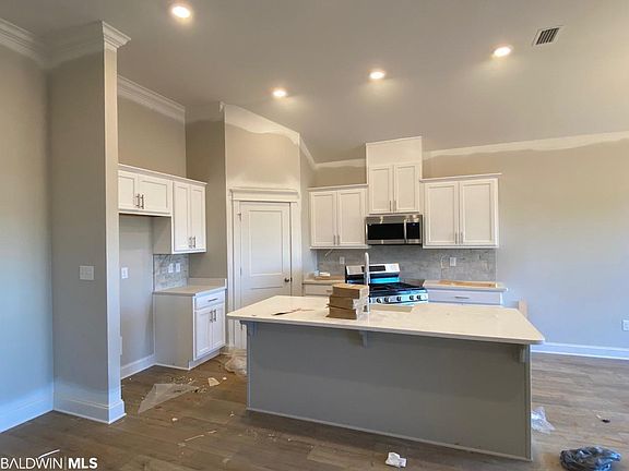UNDER CONSTRUCTION. Introducing the Bayview plan by Truland Homes located in convenient French Settlement in Daphne. This one level open concept floor plan is 1,805 sq.ft with 3 bedrooms & 2 baths. Great layout has luxury vinyl flooring throughout all the main living areas, and also in the primary bedroom. The gourmet kitchen is complete with stainless appliances including a gas range, large center island with apron front sink and extra seating, Quartz countertops, tile backsplash and large corner walk-in pantry. Right off the garage you will find the laundry room with freestanding laundry sink and a convenient mud bench for shoes and backpacks. There’s a large primary bedroom with tray ceiling and spacious en-suite with dual sinks, separate garden tub and curbless tile shower and BIG walk-in closet. Two additional bedrooms and a full bath complete the layout. This home is built to Gold Fortified standards and includes many features like energy efficient appliances and HVAC, a Smart Things Hub, Ring Doorbell, Smart Thermostat, storm shutters and more. Anticipated completion date is Dec 2022/Jan 2023. One or more principles of the selling entity are licensed real estate agents/brokers in the State of Alabama. Floor plans and elevations shown here are for example only and are subject to lot specifics, upgrades included, and neighborhood requirements.