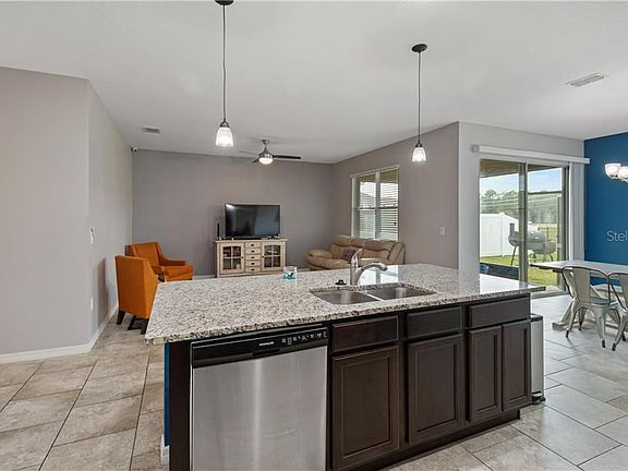 Move right in to this gated 55+ community located in the Lakes at Laurel Highlands, Heritage Landings. This home has a great layout featuring 2 bedrooms, 2 baths plus a flex room. The kitchen is perfect for entertaining with a large center island, granite counter tops and plenty of cabinet and counterspace. The master bedroom has a super large walk in closet. The master bath has dual sinks, granite counter tops and a shower. The home has security cameras that you can monitor from your phone. Relax and enjoy the view on the back screened lanai overlooking a pond with a water fountain in the middle. Gutters have been installed around the home. The backyard is large and is completely fenced. Lawn maintenance is included in the HOA. This home is conveniently located to shopping, dining, medical, the Polk Parkway and I-4.