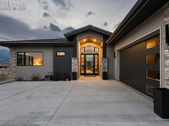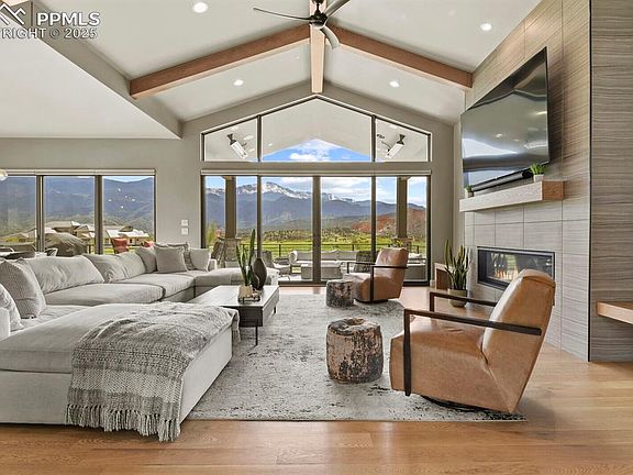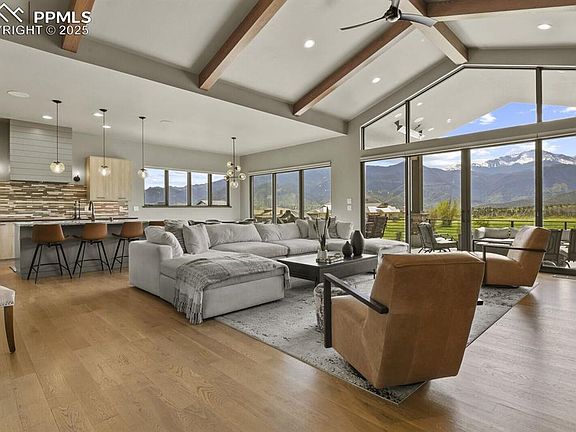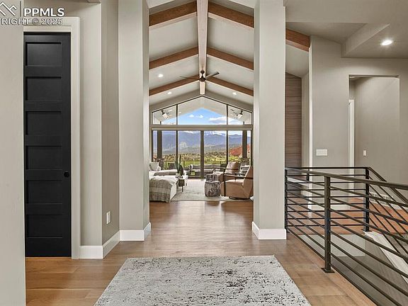 Welcome to the coveted and gated westside community of Cathedral Ridge at Garden of the Gods. This custom-built walkout ranch style home with a symmetrical design and modest exterior pays homage to the Frank Lloyd Wright inspired Prairie style design which embodies a seamless flow from interior to exterior. From the impressive glass front door to the exterior wall of windows, breathtaking 180-degree views of Garden of the Gods, Pikes Peak, and Cheyenne Mountain are captured from countless viewpoints. One can appreciate the attention to detail - exquisite hardwood floors, 14' vaulted ceilings, stylish gas fireplace, exposed wood beams, 8' doors throughout, and Hunter Douglas blinds. Sophistication abounds with Wolf/Subzero/Asko appliances, a Sharp microwave drawer, custom countertops, LED lighting, Sonos Sound System throughout, central vac, dual heater/ac system. Capitalizing on the opportunity for continuous outdoor living, the massive, covered deck with a gas fireplace and 2 electric ceiling heaters can be enjoyed year-round. Step into your private oasis/primary suite with 10' vaulted ceilings, attached ensuite, oversized spa shower with rain shower head, dual vanities, massive walk-in closet, and attached laundry room. An office space, oversized bedroom and 3/4 bath round out the main level. The 3-car attached garage features a BendPak hydraulic lift, floating cabinets, custom flooring, electric car outlet, and 20-amp freezer outlet. A custom railing and stairway lighting beckon you to the lower level with 9'8" ceilings, a wet bar, pool table, 2 oversized bedrooms and 2 full baths as well as a flex space (5th bedroom) with rubber flooring, a wall of mirrors, and a closet with a hidden room. A storage area contains a stackable w/d and dual separate 50-gallon water heaters and a door to the backyard. Walkout to the covered back patio to appreciate the custom landscaping/turf, custom fencing with 2 gates and outdoor lighting package. A One-of-a-Kind Opportunity!